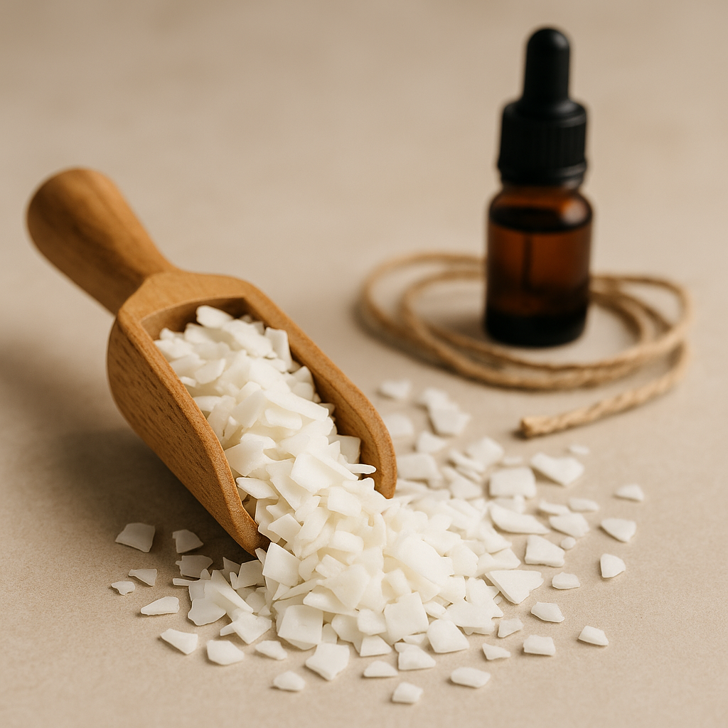 Pure Golden Wax 464 soy flakes—that’s 98–99 % hydrogenated American-grown soybean oil plus a tiny plant-based additive (also soy-derived) that helps the wax stick to the glass and keep a smooth top. No paraffin, no palm, no beeswax, no dyes, and zero “secret” mineral-oil extenders.